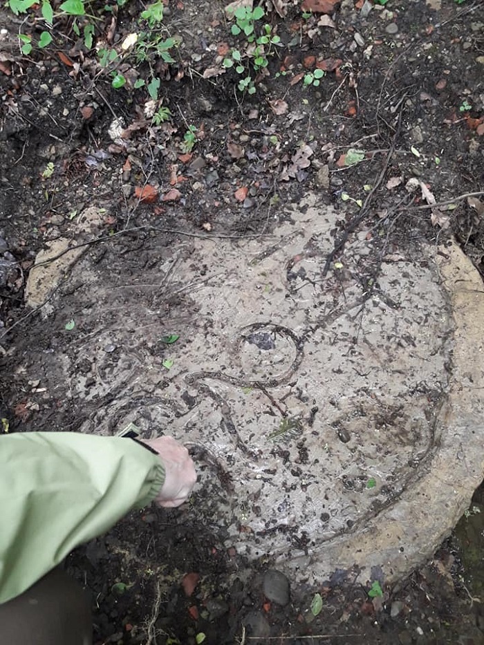Но в прошлом году во время глубокой осени, когда уже нет такой буйной растительности, я нашел те каменные блоки, на которых стояло надкаптажное сооружение над «Софией», расчистил слой на глубину где-то 20 см. от битого кирпича, камней и земли, и нашел плиту, которая закрывала вход в устье источника.
