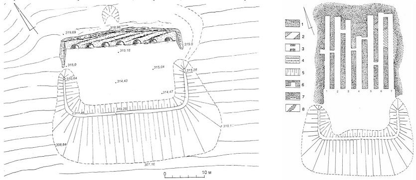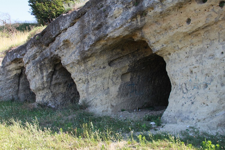 Проходим все пещеры, они примерно одинакового размера. На стенах – следы грубого инструмента, которым выдалбливали породу. По мнению ученых, пещеры вырубали в известняке железным долотом в виде прямых косых линий длиной 57 сантиметров. Все исполнено «одним почерком», следовательно, с камнем работал один мастер. Или все работали как один. Результаты научных исследований свидетельствуют, что объем выбранного при сооружении этого комплекса камня достигает 1157,42 куб. м. Этим камнем древние мастера выложили площадь перед пещерами.