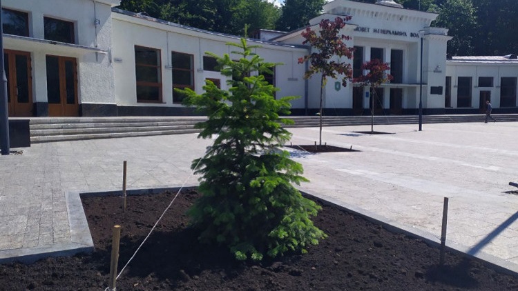 На обновленной площади, застелили новую брусчатку, высадили экзотические саженцы деревьев. Предоставляла консультации по озеленению и помогала в подборе саженцев дендролог КП «Парк курортный» Ульяна Демакина.