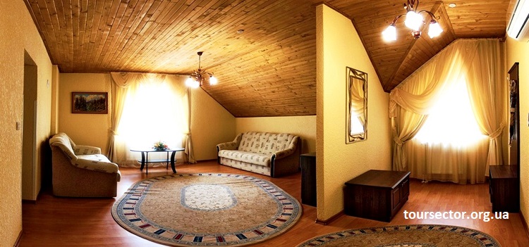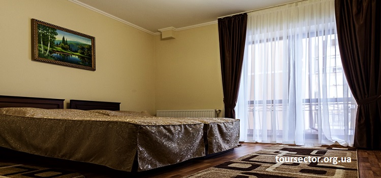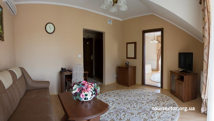 Номер «Люкс корпус» — просторный панорамный двухкомнатный номер с гостиной, площадью 42 м², из окон которого открывается вид на карпатский лес. Советуем выбрать именно этот номер для семейного отдыха. В номере: двуспальная кровать (200 х 190 см) с ортопедическим матрасом и раскладной диван, набор мебели, сейф, кондиционер, телефон, телевизор, Wi-Fi, холодильник, халаты, ванная комната (душевая, фен, набор полотенец).