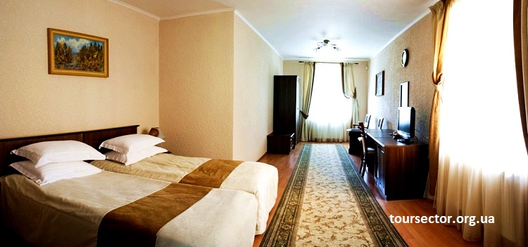 Двухместный номер «Стандарт» — однокомнатный номер в лечебном корпусе или в коттеджах, площадью 25 м². В номере: две одноместные кровати (195 х 90 см) с ортопедическими матрасами, набор мебели, сейф, кондиционер, телефон, телевизор, Wi-Fi, холодильник, халаты, ванная комната (душевая, фен, набор полотенец).