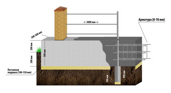 Если хотим придать забору солидность, заливаем ленту. Некоторые делают кладку облицовочного кирпича на высоту одного – трех рядов. Саму ленту с лицевой стороны можно облицевать плиткой под камень. Для заливки бетона выкапываем грунт на глубину 400 — 500 мм. В местах установки опорных столбов заглубляемся мотобуром еще на 400 — 500 мм. Делаем песчаную подушку 100 мм, тщательно трамбуем, проливаем водой. После необходимо установить опалубку и связать каркас из арматуры (8 — 10 мм). Далее заказываем миксер (машина с бетоном) и заливаем ленточный фундамент сразу целиком. Если возможности такой нет, придется воспользоваться бетономешалкой. Раствор мешаем из расчета: одна часть цемента марки М400, четыре части гравия. После заливки всего периметра не забываем накрыть ленту полиэтиленом.