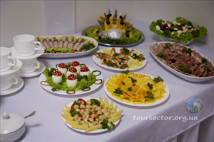 В ресторане организовано питание по системе «шведский стол», где предлагают блюда украинской, европейской кухни.