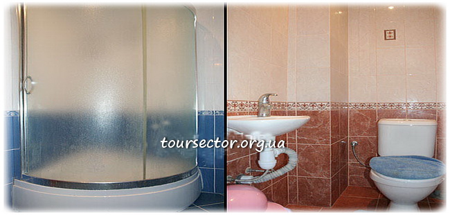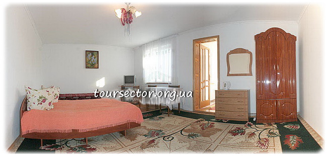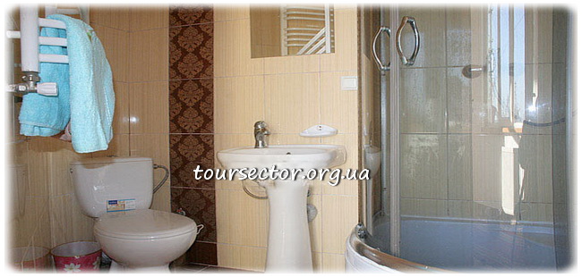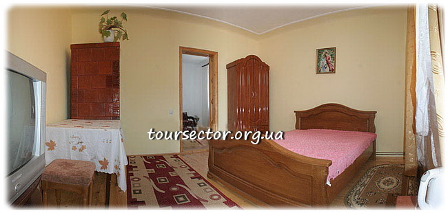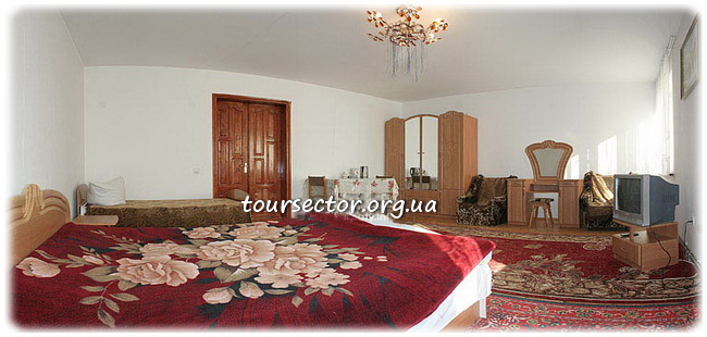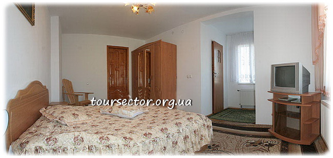 Перший поверх – двокімнатний номер великої площі 33,7 м2., в одній кімнаті – велике двоспальне ліжко, набір меблів, телевізор, в іншій кімнаті розкладний диван і набір меблів, холодильник, електрочайник. Санвузол – душова кабіна, умивальник, унітаз.