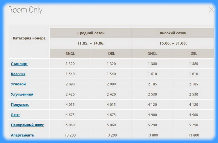 Напівпансіон                               Денний тариф                         Room Only