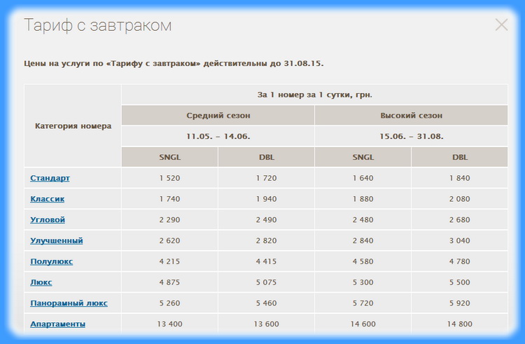 Тариф з сніданком                         Курортний тариф                       Повний пансіон