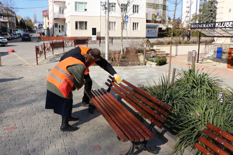 Работники коммунального предприятия «Парк курортный» периодически осуществляют дезинфекцию скамеек для сидения на пешеходных улицах города (ул. Шевченко, Майдан Кобзаря, бульвар Торосевича т.д.), поручней, автобусных остановок и скамеек на них, свалок, других мест, где находятся люди и предметы, которых они касаются или могут касаться. Строгие карантинные противоэпидемические мероприятия применено в городской больнице, санаториях, гостиницах и пансионатах города, в заведениях общественного питания, супермаркетах и магазинах, а также на центральном бювете минеральных вод.